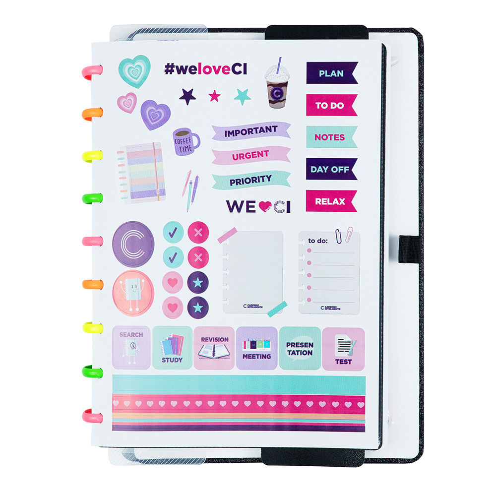O Caderno Inteligente Original que você retira as folhas e coloca quando quiser. Você pode personalizar como desejar a capa, discos, elásticos e acessórios.