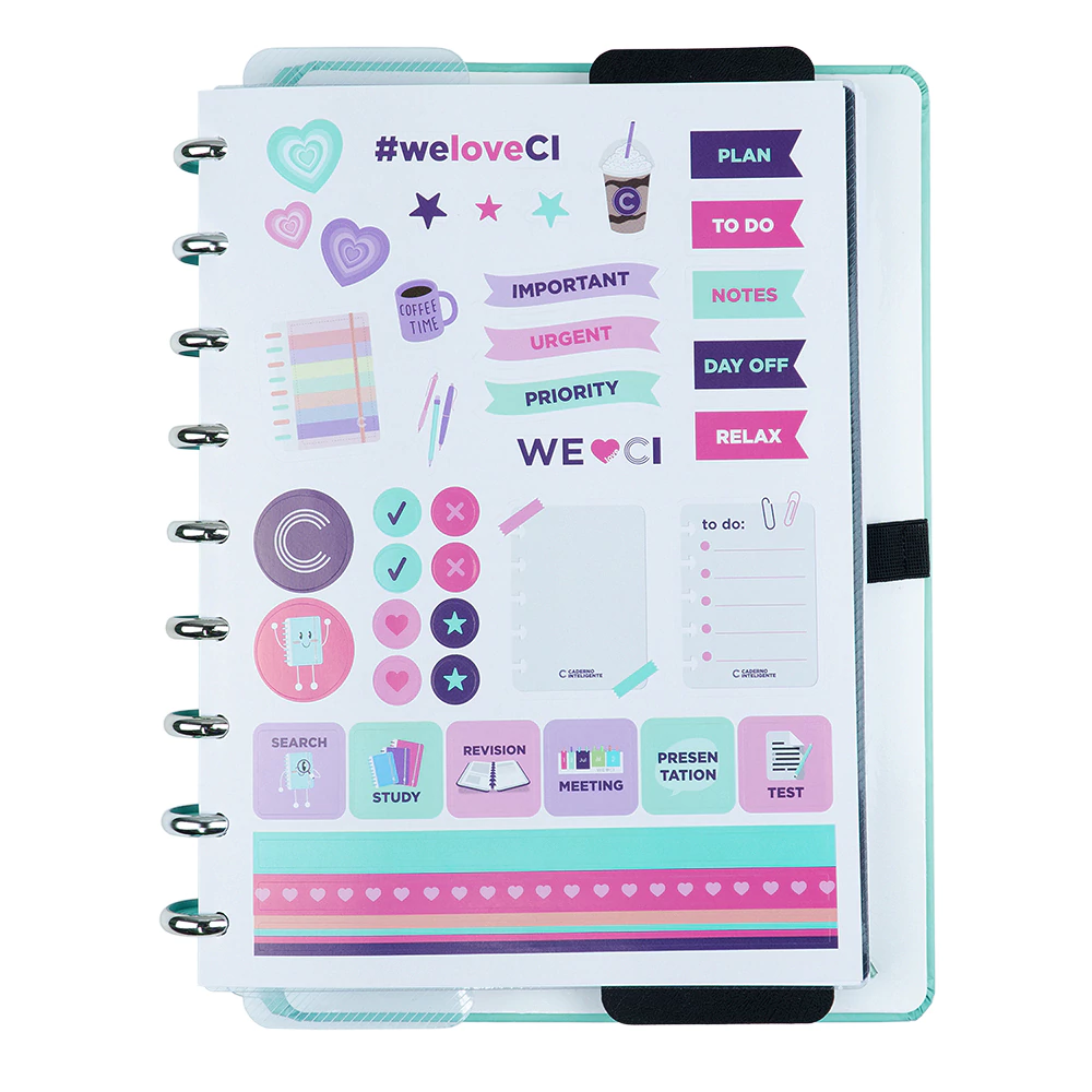 ⋆ Inteligine: Capa e contracapa rígidas, 01 folha de adesivos, 01 folha de instrução de uso e manuseio, com refis e acessórios da marca disponíveis no verso, 01 folha de identificação com calendário no verso, 50 folhas Lisas Offset 120g e 01 suporte com elástico para 01 caneta ou 01 lápis.