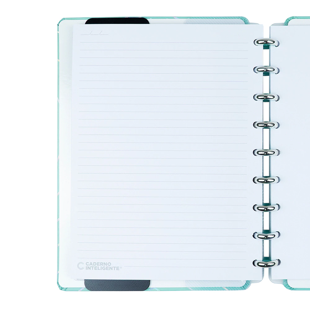 ⋆ A5, Médio ou Grande: Capa e contracapa rígidas, 01 folha de adesivos, 01 bolsa plástica, 01 folha de instrução de uso e manuseio, com refis e acessórios da marca disponíveis no verso, 01 folha de identificação com calendário no verso, 04 divisórias com abas para identificação (02 pretas e 02 transparentes), 80 folhas offset 90g (60 folhas pautadas e 20 folhas lisas brancas para impressão), 01 suporte com elástico para 01 caneta ou 01 lápis e discos M + elástico.