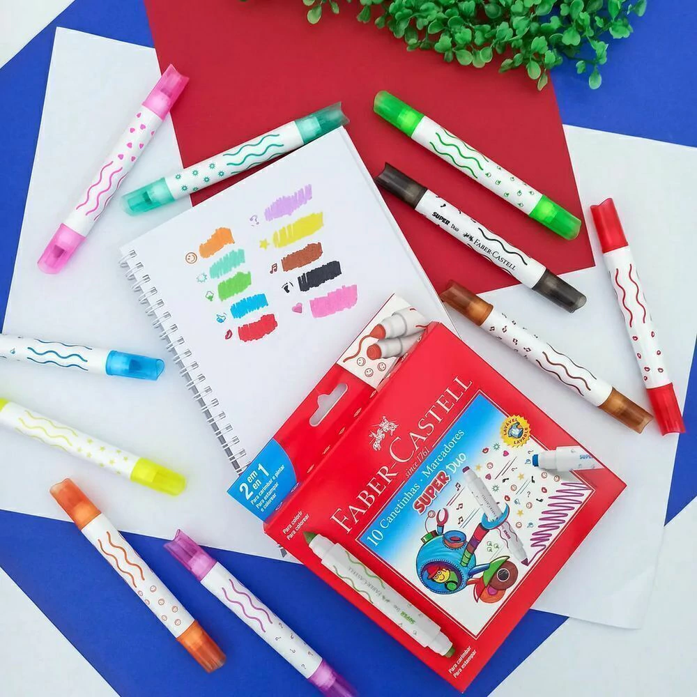 As canetinhas Super Duo Faber Castell são desenvolvidas com corantes de alta qualidade, resultando em cores mais vivas que se destacam nos trabalhos artísticos.