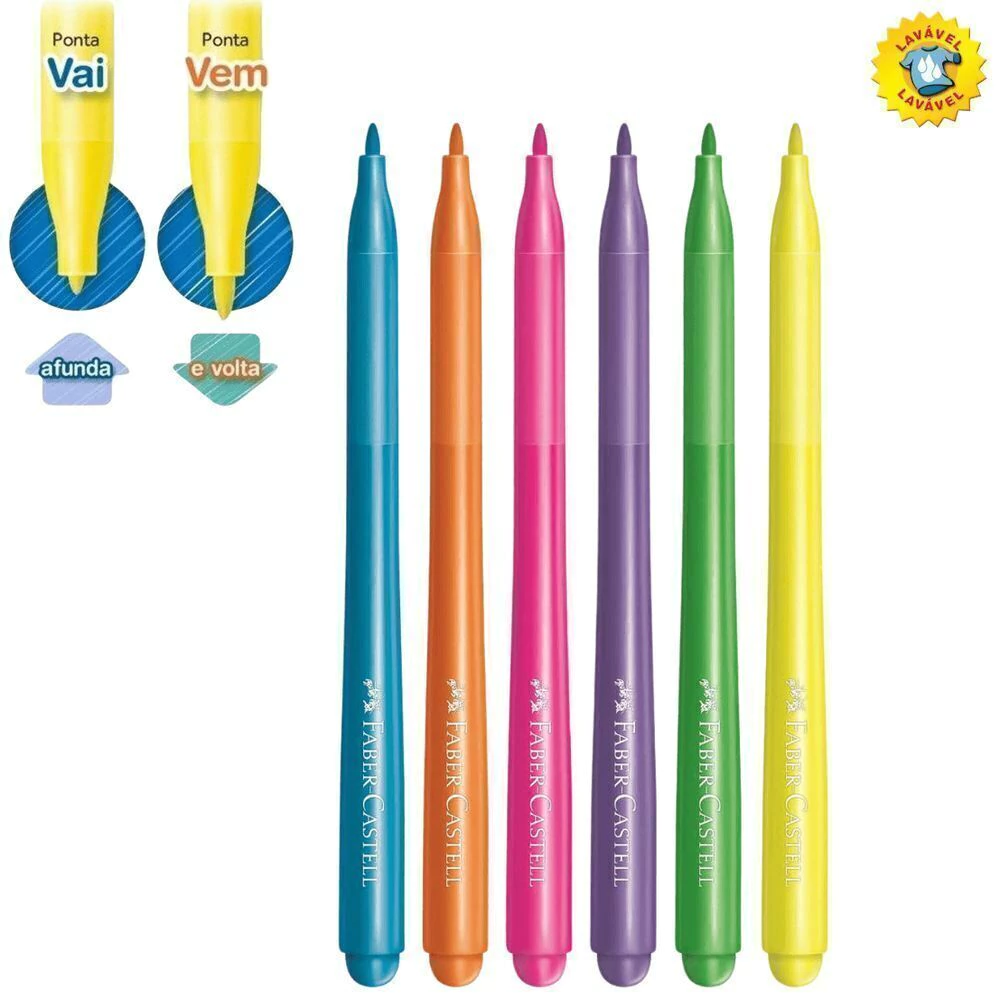 As Canetinhas Vai e Vem Neon Faber Castell oferecem cores vibrantes e um sistema exclusivo que garante durabilidade e proteção da ponta, com tinta lavável para a maioria dos tecidos.