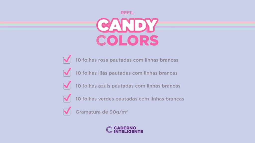 O Refil Candy Colors traz uma emoção diferente a cada página com sua variedade de cores, não deixando de lado o visual discreto e limpo das linhas brancas.
